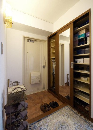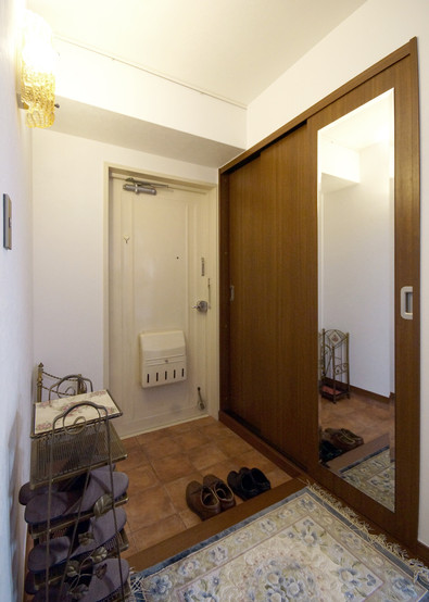 鏡付き3枚引き戸を玄関収納の扉に。内部は造作でお客様のご要望に合わせて製作しました 。