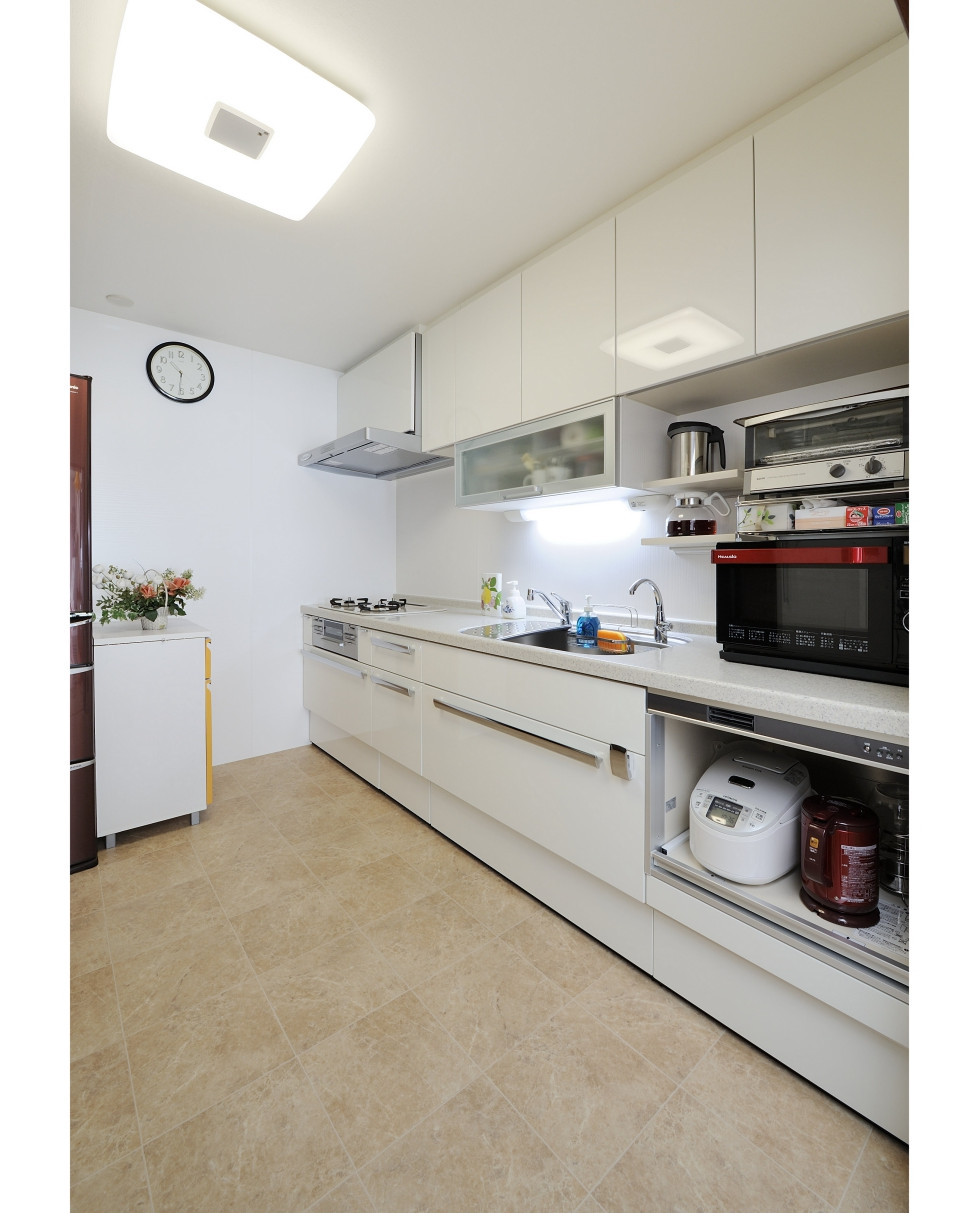 キッチンはL型からI型の3000㎜へ。シンク横に家電収納を組み込みました 。