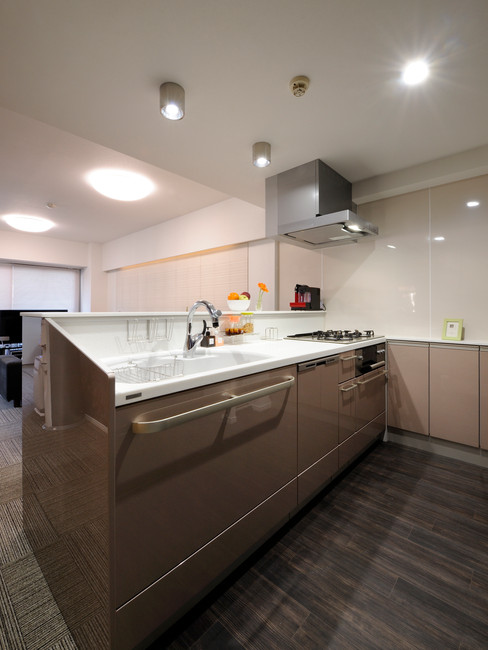 壁に向いていたI型キッチンを対面キッチンへ間取り変更。配管スペースを利用してゴミ箱置と可動棚を設置。